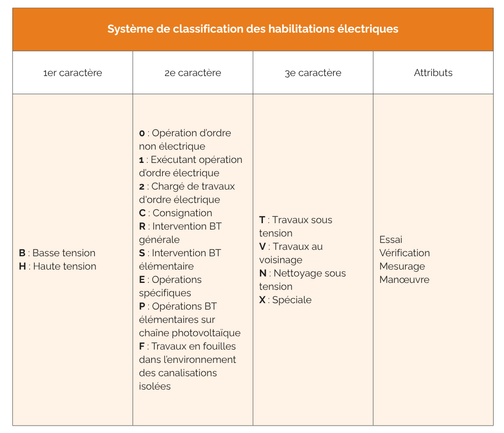 L’habilitation est codifiée par un système de symboles alphanumériques qui indiquent précisément les compétences et limites de chaque salarié habilité :